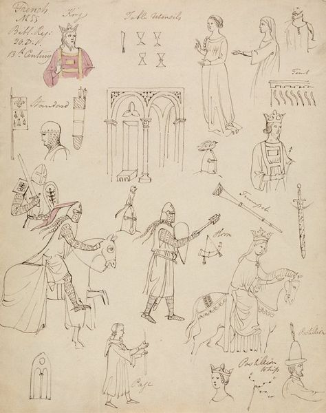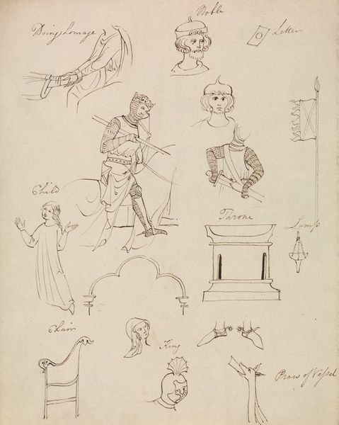 Editor: This drawing by Józef Simmler, created between 1861 and 1867, presents a captivating compilation of Baroque and Gothic motifs. My first impression is its lightness, both literally in the pencil strokes and figuratively in its whimsical juxtaposition of historical styles. Curator: Indeed. The assemblage, while seemingly informal, reveals Simmler’s acute attention to detail. The linear precision with which he renders each element—the elaborate costumes, the weighty furniture, the imposing architectural fragments—highlights the distinct characteristics of both Baroque and Gothic forms. Note how the verticality of the Gothic arch contrasts against the ornamental extravagance of the Baroque chairs. Editor: Thinking about the materiality here, the choice of pencil itself speaks volumes. It’s a humble material, readily accessible, almost democratic in its nature, allowing the artist to rapidly capture and iterate upon these historical forms. Was Simmler perhaps contemplating the labor involved in crafting the originals, maybe juxtaposing it with the relative ease of his medium? Curator: Perhaps. Although, considering the artistic conventions of academic art during this period, I lean more towards interpreting this sheet as a study. The graphic organization creates visual relationships and juxtapositions meant to study each object's formal values. We observe a precise hand mastering the depiction of textures and volumes, a common exercise for artists aiming for historical accuracy within grand compositions. Editor: So you believe this more about elevating pencil drawing as a tool, to be studied as equivalent to those traditional craft skills of furniture making. I can see the value of each sketched object if we look at the image through that lens, since he elevates the image with the academic approach. Curator: Precisely. By bringing together these disparate historical styles and articulating them so clearly through his graphic hand, Simmler's demonstrates artistic skills of both observation and analysis. The entire study acts as preparation towards Simmler's paintings focusing on history, figuration and the renaisance, such as Barbara Radziwiłłówna. Editor: The material constraints of the medium are intriguing but secondary to the forms depicted, now I see them anew, formal analysis helps to illuminate Simmler's focus. Thank you. Curator: And thank you for helping examine those historical roots and their relationship with this sketch as a means. It makes Simmler's motivations easier to discern.