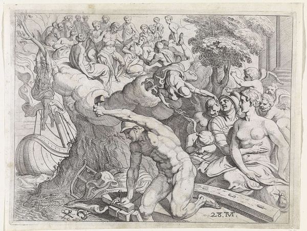 Theodoor van Thulden created this print of Neptune stirring up a storm in the 17th century. During this period, the Dutch Republic was a major maritime power, and depictions of the sea and its mythological ruler, Neptune, were particularly resonant, symbolizing power and control over the oceans. Van Thulden’s print captures a moment of intense activity and divine intervention. Neptune, traditionally figured as a virile older man, is shown commanding the elements, unleashing a storm upon the sea. The bodies of the figures here are idealized, recalling a classical aesthetic. The scene is turbulent, filled with figures struggling against the storm's force. Consider the role of mythology in shaping cultural values. Neptune's power reflects a society deeply invested in maritime trade and naval dominance, with all the attendant colonial implications. This print not only displays artistic skill but also embodies the complex relationship between humans and the natural world, and the drive to control it.