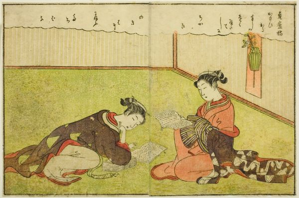 Editor: This woodblock print, a double-page illustration from Suzuki Harunobu's "Picture Book of Spring Brocades," dates back to 1771. I’m really drawn to the gentle, almost dreamlike quality of the scene, but I find it curious as a ‘landscape’ since the human element dominates. What stands out to you when you look at this piece? Curator: It's true, isn't it? Landscape often serves merely as a backdrop to human activity. To me, it whispers of enclosed spaces, of quiet observation and reflection, as if we’re glimpsing a stolen moment. The two women inside are in dialogue with something, someone out there that remains beyond our gaze. Notice the paper walls; those vertical strips create these parallel, superimposed screens... It creates a layered composition that draws your eyes toward that blossoming plum tree. Doesn’t that, in itself, feel symbolic, promising and eternal, as if a subtle hope pervades? What does spring signify to you in the piece? Editor: It really hits home that nature, represented by the blossoms, seems separate yet so vital. It definitely has a kind of hopeful feeling, this almost yearning in them as they reach toward spring! Curator: Indeed! Perhaps they see in those delicate blooms a reflection of their own aspirations, a silent dialogue between the human spirit and the promise of renewal. And look at their clothing, how meticulously rendered. What a perfect glimpse of fleeting beauty, made eternal through ink and wood. Editor: It's fascinating how much meaning can be packed into such a seemingly simple scene. I will keep a closer watch of those details when I look at artworks! Thanks for your insight. Curator: My pleasure! It's through these shared observations that art truly comes alive, isn't it? Always look beyond what you think is visible.