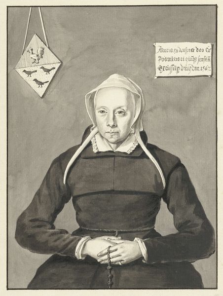 Editor: Here we have a portrait drawing made with ink on paper. It's called "Portret van een vrouw met het wapen Van Slingelandt-Brouwer" and dates from 1720-1792. It’s currently housed in the Rijksmuseum and attributed to Aert Schouman. The woman’s face feels so direct, almost confronting, but everything else about the drawing feels very formal. How would you interpret this piece? Curator: The formality strikes me too. It's intriguing to consider the socio-political function of such portraits in the 18th century. The inclusion of the Van Slingelandt-Brouwer coat of arms is very deliberate. It signifies her lineage, her social standing. Think about how portraiture, especially for women, served as a means of asserting family identity and legacy. Editor: So, the portrait is almost like a social document? A way of saying, "This is who I am and where I come from?" Curator: Exactly. And the Rijksmuseum's acquisition of the piece reinforces this idea. Museums play a role in preserving and showcasing particular narratives. How does placing this portrait within a national museum impact its meaning? Editor: It definitely elevates it, gives it more weight and historical significance. Is it typical to include that family's coat of arms on the same canvas? Curator: Common, yes. Although including it beside the subject signals more pride and connection. It's interesting to consider how artistic conventions contribute to these constructed identities. The level of detail afforded the woman suggests that she, or her family, possessed means. Consider then how patronage impacted Schouman's representation, in terms of who got portrayed and how. Editor: So much to unpack in what seems like a straightforward portrait! I never thought about the museum’s role in solidifying that social statement too. Curator: Indeed! Looking at art through its history teaches us just as much about the artist as it teaches about those they portrayed.