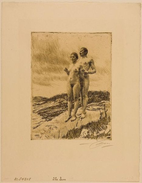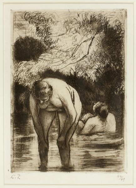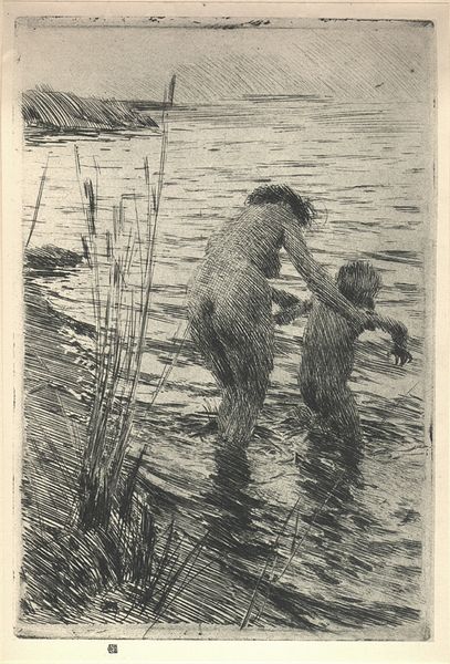 Franz von Stuck rendered "Faun und badende Nixen" using expressive lines and layered washes, generating a complex interplay of light and shadow. The nude figures, set against the dark, undulating backdrop, create a compelling visual contrast. Stuck, working at the turn of the century, engaged with the Symbolist movement, a time when artists explored psychological and mythical themes to challenge traditional academic styles. This work exemplifies the Symbolist interest in unsettling the viewer through unconventional, often ambiguous narratives. The composition, divided into distinct spatial planes, draws attention to the faun's voyeuristic gaze. Stuck uses stark tonal contrasts and the gestural quality of the brushwork to reflect the psychological weight of the scene. The faun is both part of and removed from the scene, reflecting the Symbolist concern with desire, observation, and the human condition. As such, the painting challenges traditional notions of beauty and decorum.