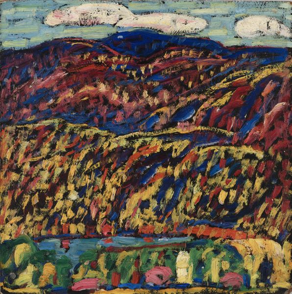 Alexej von Jawlensky made this painting, Summer Evening in Murnau, using broad strokes of intense color. He’s not just painting what he sees, but how he *feels* about what he sees, right? Check out how the mountains, rendered in deep blues, almost vibrate against that bright, orangey-yellow sky. The paint isn’t overly thick, but you can still see the marks, the energy of his brush. It’s like he’s wrestling with the landscape, trying to capture its essence with these bold gestures. There's something almost Fauvist about it. My eye keeps going to the line of dark blue that runs across the bottom third, separating the land from the water. It’s such a simple, almost childlike stroke, but it anchors the whole composition. It reminds me a bit of Matisse, with that same willingness to simplify and exaggerate. Ultimately, Jawlensky is not trying to give us the definitive version of this landscape. Instead, he invites us to experience a moment, a feeling, a way of seeing.