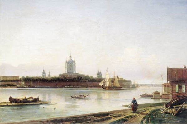 Curator: It feels like a sigh. A gray, dreamy sort of sigh from a city awakening. Editor: We are looking at Lev Lagorio’s oil on canvas from 1859, titled "View of the Neva and Peter and Paul Fortress.” A sprawling cityscape bisected by the Neva River. Notice how Lagorio balances industry and nature. Curator: Yes, there’s the Fortress, almost shimmering in the distance, juxtaposed with these grounded, almost gritty, docks in the foreground. You can almost smell the river, you know? It makes me think about the labor that sustained that grandeur in the distance, those fine buildings. All this busy labor right here. Editor: Absolutely, and the artist's treatment of materials reflects that. The loose brushstrokes that create the illusion of choppy water. How many figures can you see laboring near the docks? They are moving something on those heavy looking crafts. The romanticized skyline juxtaposes against the daily toil. I also wonder about the relationship between production of this kind and how it influences painting as a method itself. Curator: Makes you think, what were they carrying? Probably things the fancy folk up river needed, right? It all feels a little melancholy, yet so full of life. Editor: Precisely. The watercraft become integral parts of the city's fabric. These aren’t decorative. The very surface of the water indicates labor and traffic as material realities. The movement in the painting also draws me into imagining its function for distributing commodities. It also is interesting how it challenges high art with this focus on ordinary lives and industry, reflecting a subtle tension. Curator: In a way, the whole painting, like the Neva, becomes a conduit. Linking the mundane and the magnificent. It really hums, doesn't it? Even after all this time. Editor: Indeed. And by recognizing those connections, that painting hums that labor on, making us listen closer to these whispers of history embedded in these materials.