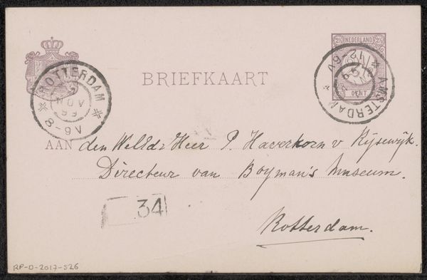 Editor: So, this is "Briefkaart aan Philip Zilcken" by Christina Elizabeth Perk, dating to before 1898. It’s ink on paper—looks like a postcard. The handwriting gives it such an intimate, almost secretive feel. What historical context am I missing? Curator: The postcard itself is a fascinating artifact of social and technological change. Think about it: before widespread phone use, personal correspondence *was* social media. And artists? They participated! How does the use of a commercially available card, rather than a hand-made sheet, affect the perceived value or intimacy of the artwork? Editor: That’s a good point; the printed “Briefkaart” standardizes it in a way. Still, that playful handwriting fights against the standardized card. Almost like a personal rebellion. Curator: Precisely! The artist uses a common medium for personal expression, embedding her visual language and specific context – a note to Phillip Zilcken, in her script – against the backdrop of everyday life. Consider the power dynamics here: an established figure in Perk sending artwork through an official public system? Editor: Now that you point it out, the postal markings – the stamps and cancellations – add to the story, proving the artwork went through those institutional processes. It’s so different from something created purely for an art market, for a gallery. Curator: Exactly. It operated within specific, public communication networks. Understanding these networks helps us to reposition our understanding of the artists as social actors and of her practice more generally. And think of all we don't know -- the unwritten conversation that birthed it! Editor: So true! This postcard makes me think about all the social structures that even small works like these are tied to. Curator: Absolutely, it provides a window into an intimate social network operating within larger public institutions.