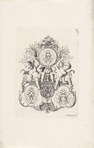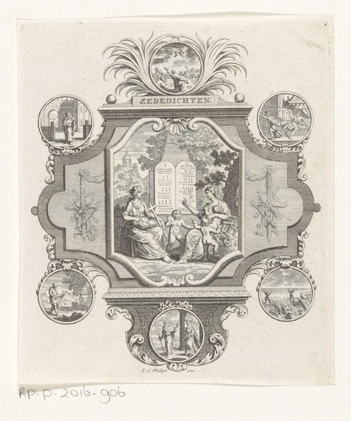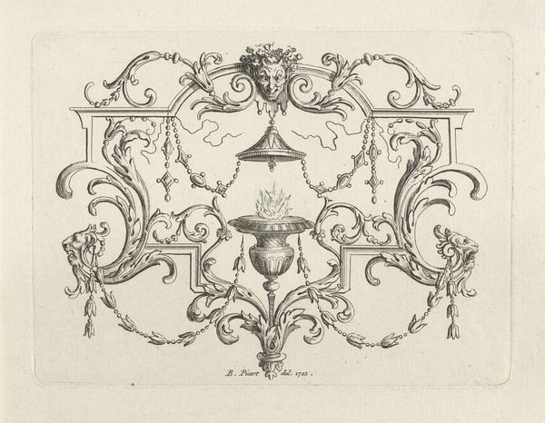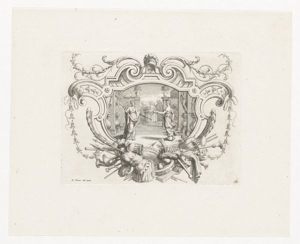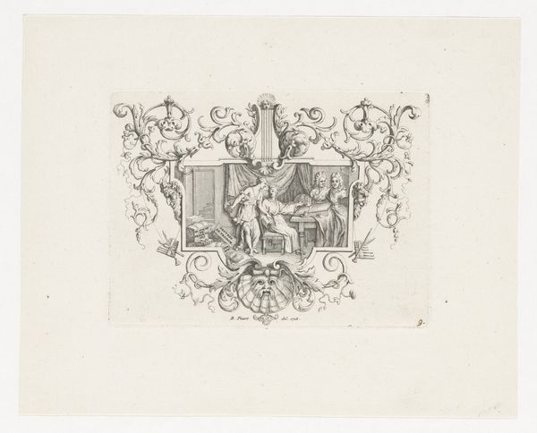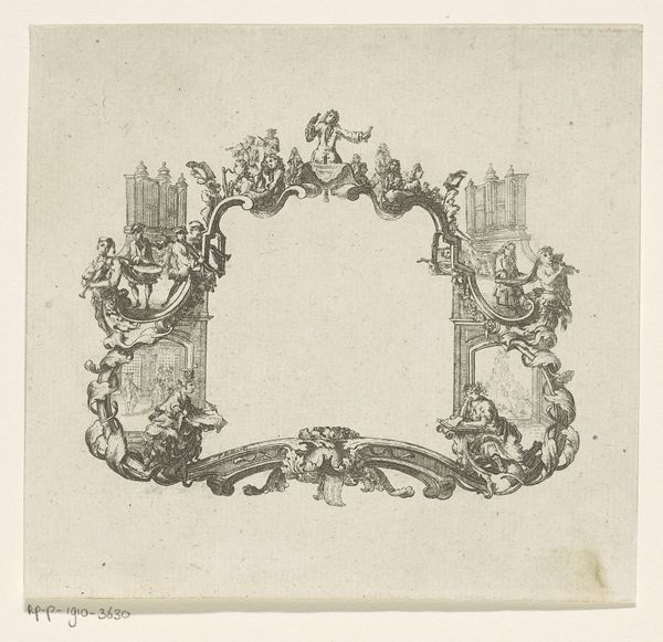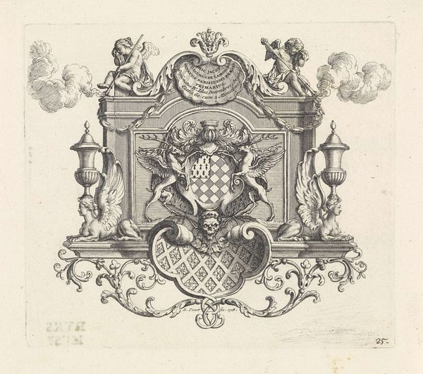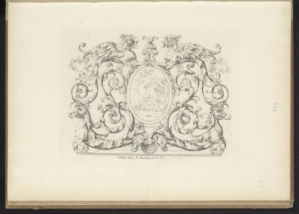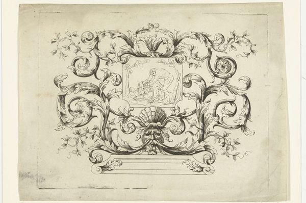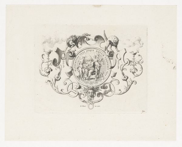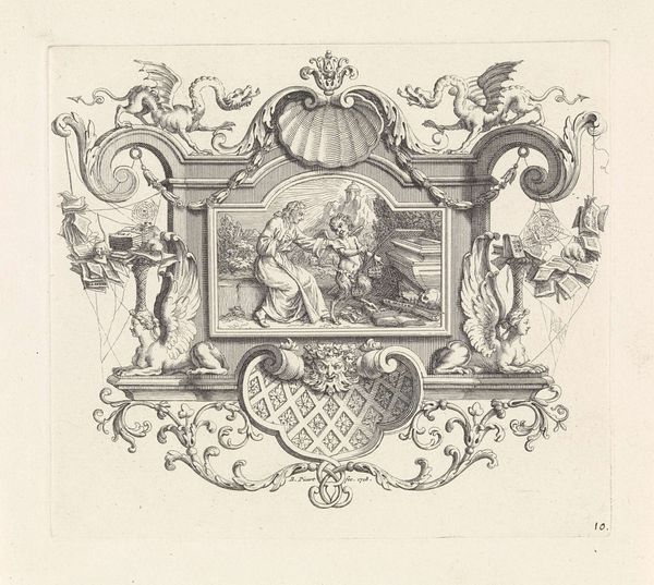 Bernard Picart created this intricate etching, "Beteugelen van Pegasus," sometime between 1673 and 1733. The image is a complex tableau, meticulously rendered with fine lines that define forms and textures. The composition centres on a framed scene, depicting figures attempting to bridle Pegasus, the winged horse of Greek myth. Picart contrasts the dynamic energy of the central scene with the static, decorative elements of the frame. The frame is adorned with motifs of classical origin such as sphinxes and elaborate flourishes. The scene is encased in a structure that mimics architectural ornamentation, suggesting a commentary on the nature of artistic control and the domestication of creative inspiration. The crisp lines and balanced arrangement reflect the Enlightenment's emphasis on order and reason. The very act of framing, underscores an attempt to contain and classify the untamed aspects of imagination and creativity.