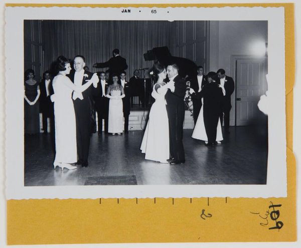 Robert Burian captured this image of a couple on a dance floor at a ball sometime around January 1965. The photograph, mounted on what appears to be a manila envelope, likely documents a specific social event. The context of such gatherings for middle class white America in the 1960's is one of post-war optimism. The composition focuses on a man and woman dressed in formal attire, standing stiffly as if posing for the camera, rather than caught in candid movement. What I find compelling here is how the image reflects societal expectations around gender and class. The woman’s elaborate gown and gloves, along with the man's tuxedo, signal an adherence to traditional roles and aspirations. This photograph offers a glimpse into a particular slice of mid-century American life, laden with its own set of unspoken rules and expectations.