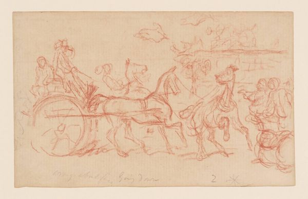 Curator: This is Hablot Knight Browne’s ‘Wrong-about face – going down’. A Traffic Incident. It's a caricature drawing in the Tate collection, sketched with a sanguine crayon. Editor: It feels chaotic, like looking at a dream remembered in fragments. The horses are wild, the figures almost dissolving into the background. Curator: Browne was known as “Phiz” and illustrated Dickens' novels. He uses caricature here to capture social disruption, a world turned upside down. Think of the horse as a symbol of power, now out of control. Editor: Right, and the sanguine crayon gives it a sense of urgency, of heat. Like the whole scene is flushed with anxiety. It speaks volumes about the unpredictability of life, doesn't it? Curator: Precisely. It’s a great example of how Browne turned everyday incidents into memorable social commentary. Editor: A little like how we turn everyday conversation into… well, hopefully something memorable too!