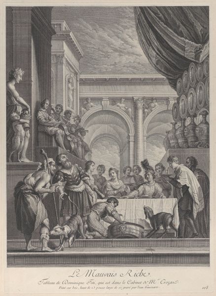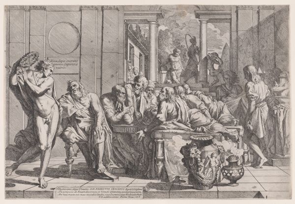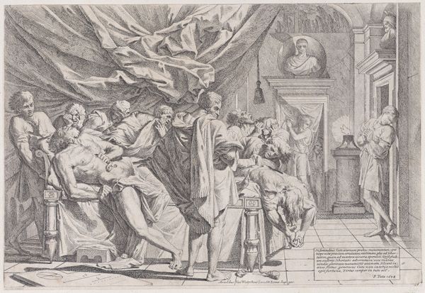 Jean Turpin’s engraving depicts the death and miracle of Filippo Benizi, a saint of the Servite Order. The scene brims with potent symbols of faith and miraculous intervention. Observe the prominent display of the crucifix, set upon an altar, flanked by candles—icons of sacrifice and divine presence. Below, Benizi's body lies in state, around which the miracle unfolds: a man rises, seemingly resurrected. This motif echoes the Raising of Lazarus and anticipates Christ’s resurrection. The upraised hand, a gesture recurring in antiquity, from emperors granting clemency to deities bestowing blessings, has evolved here into a sign of miraculous healing. Consider its parallel in classical depictions of Asclepius, the Greek god of medicine. This powerful gesture taps into our collective memory and subconscious yearning for salvation. Through these recurring motifs Turpin connects the viewer to a long history of hope, faith, and the enduring power of belief.