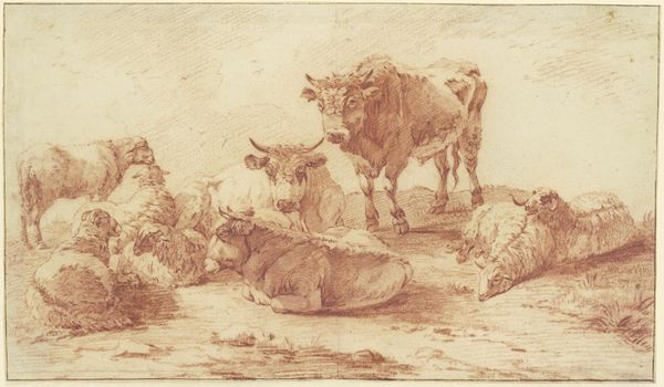 Rosa Bonheur created "A Few Sheep and a Ram in a Stable" using black and white chalk, and brown wash. Bonheur achieved fame in a male-dominated art world, becoming known for her remarkable ability to capture the essence and individuality of animals. During the 19th century, women faced significant barriers to artistic training and recognition. Bonheur challenged these norms by pursuing her passion and achieving commercial success, which allowed her financial independence. As a woman, she had to obtain police permission to wear trousers in order to visit farms and slaughterhouses for her art. Bonheur lived openly with her female partner, and saw herself as outside traditional gender roles. Her choice to depict livestock reflects the growing interest in rural life. Through her skilled draftsmanship, Bonheur elevates the status of these animals, inviting viewers to appreciate their beauty and dignity. Her sensitive portrayal reflects a deep appreciation for the natural world, challenging conventional hierarchies.