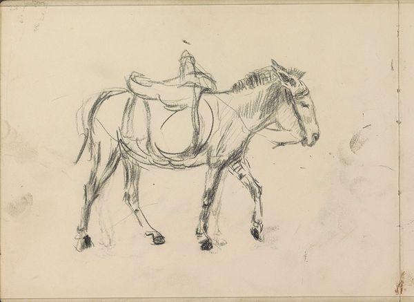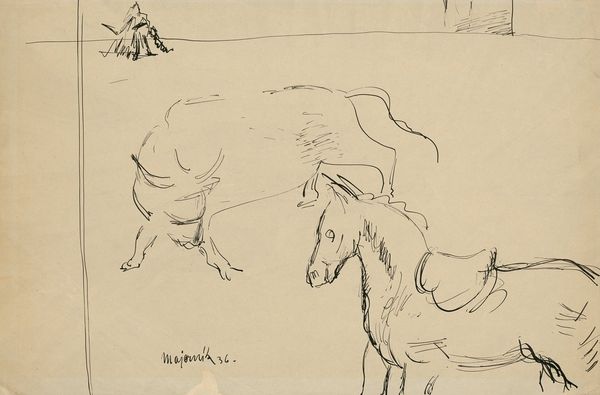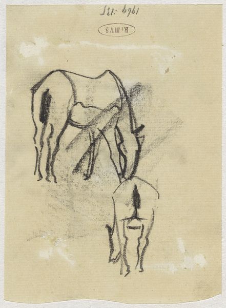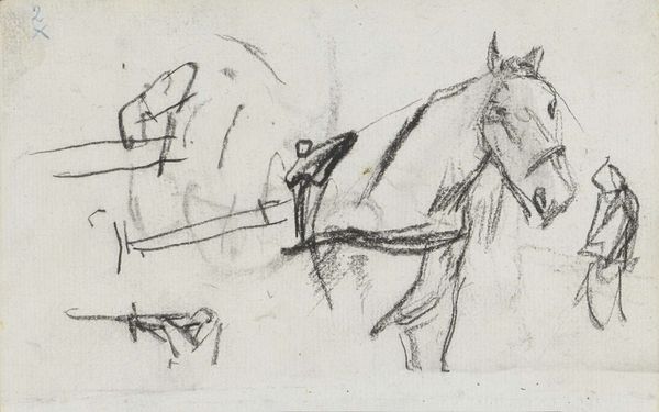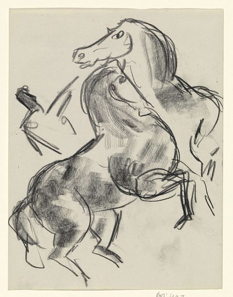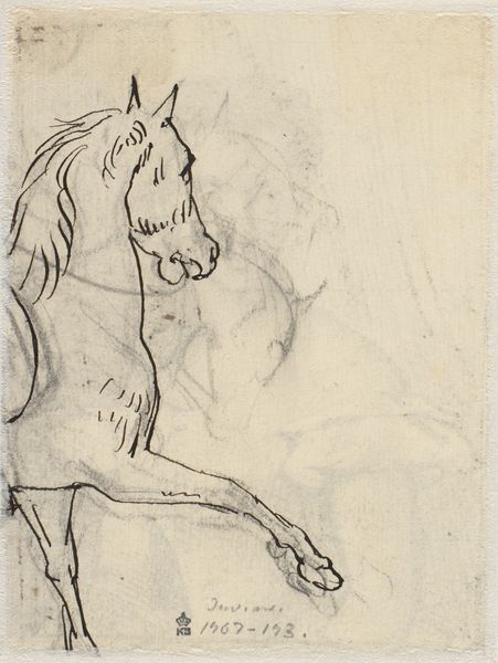 Editor: This is Barry Flanagan's "Cob Study," a line drawing of horses in the Tate Collection. It feels very ancient to me. What symbols or ideas do you see represented here? Curator: The horse is a powerful, cross-cultural symbol, often linked to virility, freedom, and the untamed. This drawing evokes Paleolithic cave paintings, suggesting a primal connection. Do you see how Flanagan uses line to suggest both the form and the spirit of the animal? Editor: Yes, it's like he's capturing their essence with just a few strokes. It feels both immediate and timeless. Curator: Precisely. It reminds us that certain images resonate across millennia. What feelings arise when you consider that continuity? Editor: It’s humbling, realizing we're part of this long visual conversation.
