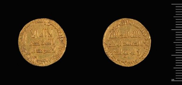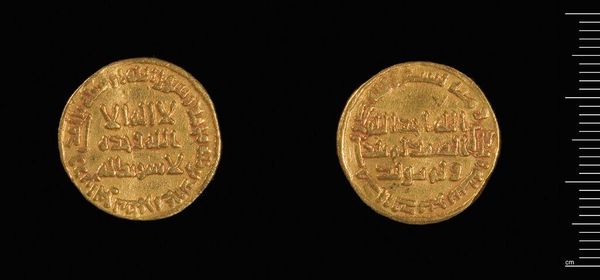 Curator: Here we have a gold dinar, attributed to Al-Walid I, currently residing at the Harvard Art Museums. Editor: It's so small, yet radiates this incredible sense of permanence. Like holding history itself in your palm. Curator: Indeed. The coin's composition centers around intricate kufic script, a key element in understanding its symbolic value. Consider its circular form. How might we interpret its geometry as an emblem? Editor: Well, circles usually mean unity, wholeness, maybe even eternity, right? So on a coin, that's power...authority...it feels like a statement beyond just currency. Curator: Precisely. The weight, 4.25 grams, offers another point. What inferences might you draw? Editor: It's light, but gold. It makes me imagine the bustling marketplaces, the weight of trade and influence. What a treasure, literally and figuratively. Curator: A tangible artifact, allowing us to connect with the past. Editor: Absolutely. Each detail resonates, whispering stories of empires long gone.