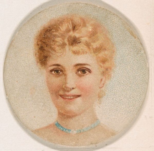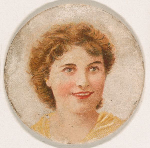 This is a portrait of a woman from the Novelties series, created by Kinney Brothers Tobacco Company. Note the circular format and the delicate lithographic technique. The design elements are constrained within this small, almost coin-like space. Consider how the artist uses composition to frame the subject. The woman is positioned off-center, gazing to the left, which creates a dynamic tension within the circular boundary. Her form is softly rendered, with attention to the texture of her hair and the gentle folds of her dress. The color palette is muted, dominated by pastel shades that evoke a sense of nostalgia. The serial nature of this work is striking; it reflects a shift towards mass production. Each card is a signifier, not just of an individual, but also of a broader cultural moment. The image is both a portrait and a commodity, blurring the lines between art and advertising. The circular format itself, suggests ideas of unity and enclosure, inviting us to consider how such forms shape our perception.
