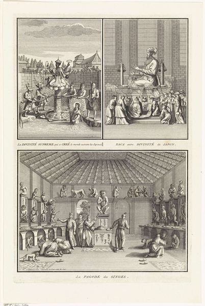 Editor: This is “Japanese God, Pagoda and Preacher,” an engraving from 1724 by Bernard Picart, housed here at the Rijksmuseum. The print is composed of three vignettes, and what strikes me immediately is the level of detail the artist achieves with what appears to be simple line work. How do you approach a piece like this, with such a high level of visual information? Curator: Precisely. The meticulousness of Picart's line is indeed paramount. Observe how each distinct area--the ‘Japanese God,’ the pagoda, and the preacher-- is given definition not through tonal variation, but through a conscious arrangement of line. Note how the artist utilizes hatching and cross-hatching techniques to describe form. This very linear construction yields clarity. What is foreground and what recedes, becomes immediately legible. The figures, architecture and landscaping are readily understood due to their structural coherence. Editor: It’s fascinating how those techniques create a sense of depth even without color. Do you see a hierarchy at play in the composition, or how are we meant to visually navigate each framed area? Curator: I think Picart invites us to visually triangulate. The upper left and upper right areas function, at least initially, as a kind of visual diptych; with the 'preacher' below serving as synthesis. Consider the geometry-- the orthogonal lines converging towards a vanishing point, which further clarifies the subject matter and, ultimately, reveals a conscious understanding of how structure begets meaning. Editor: So it’s almost like the placement mirrors the narrative – a visual statement on cultural observations. Curator: I am delighted to see how the arrangement reinforces its formal statement and reflects its content. That the meaning of an image is inseparable from its visual framework is the key.