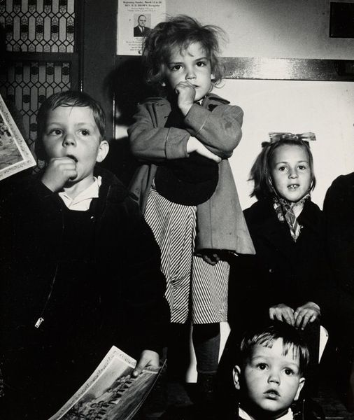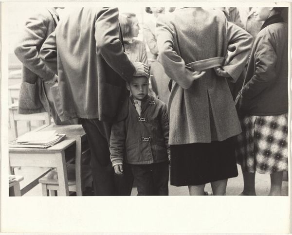 Curator: This is Gordon Parks’ “Doll Test, Harlem, New York.” Likely taken sometime between 1947 and 2019, we’re viewing a gelatin-silver print that freezes a loaded moment in time. What springs to mind for you? Editor: A kind of quiet unease. It's stark, the contrast intense. And the child's upward gaze… there's such a gravity to it, as if he's trying to decipher a puzzle far beyond his years. Curator: That gravity you're sensing is no accident. Parks was a master at layering symbolism. Notice the dolls – one white, one Black – held aloft by hands just outside the frame, almost puppeteers of this child's perception. Editor: Right, they are so obviously presented. Dolls often symbolize innocence, play, childhood. But here, they’re tools. The visual symbolism alludes to cultural constructs, perhaps subconscious biases inflicted on children. The choice between dolls becomes a painful allegory. Curator: Exactly. Parks directly references the famous "doll test" experiments which revealed the psychological damage caused by segregation. And by setting it in Harlem, he’s rooting it in a specific cultural context. Editor: I can’t help but feel how profoundly the image resonates across generations. Even decades later, this single frame speaks volumes about identity, prejudice, and the fragile self-image of children facing systemic racism. The monochrome enforces this feeling. Curator: It's fascinating how Parks can distill such complex issues into a single, visually striking photograph. He’s not just documenting, he’s forcing a confrontation with uncomfortable truths. Editor: This is an image demanding the viewer acknowledges that what happens in childhood leaves long-lasting scars. We are compelled to think about that as the real issue at play in the image, what is it that children see when looking at these dolls and by extension themselves? Curator: Precisely. Parks' image invites reflection on these complex issues, forcing us to think about history's reverberations and ongoing struggles with race. Editor: It serves as a powerful, poignant reminder of a painful legacy. Thanks to Parks for having the courage to see what so many tried not to.
