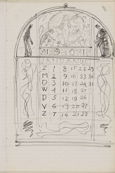 Curator: My gut reaction? This thing has major Edward Gorey vibes, right? Like, delightfully dark. Editor: You've landed on something. What we have here is “Ontwerp voor een kalender,” or Design for a Calendar, dating from around 1901 by Gerrit Willem Dijsselhof. It's a pencil and ink drawing on paper. Curator: It’s rough, like straight from the sketchbook. Look at those almost ghoulish figures flanking the calendar grid. There's an intentional playfulness amid the somewhat macabre theme. Editor: Absolutely, the visual language employed situates the work firmly within the Art Nouveau movement, but Dijsselhof was more than just an ornamentalist. If you examine the piece closely, you’ll note a tension. In the early 20th century, the rise of industrial society brought a need for systematic planning, represented by the regimented calendar itself. Yet, this is juxtaposed against organic and somewhat surreal elements, like those distorted figures on either side, thus challenging conventional societal boundaries. Curator: Well, and beyond societal, personal. I feel like a page torn out of somebody's head. There's a weird energy between those formal elements and these strange subconscious wisps. What even *are* those flowing shapes? It feels intensely personal, you know? Like an anxiety dream trying to masquerade as home decor. Editor: Dreams are critical here. This work resonates within broader artistic dialogues exploring themes of existential angst in times of significant change. Dijsselhof reflects these societal currents via personal reflection, grappling with rapidly transforming social, cultural, and philosophical frameworks. The question arises: Is this piece actually grappling with existential tension amid a changing world, or is that tension introduced by an over-reading through contemporary eyes? Curator: Good question! Still, it sticks with you. Makes you think about what you schedule and why. Like, am I just filling the grid or living, you know? It feels weirdly modern. Editor: Exactly, its exploration of planning, creativity, and the tensions between them gives the sketch lasting resonance. Curator: I'll say. Even a century later, it’s provoking thoughts about what really occupies our days.