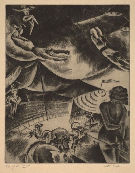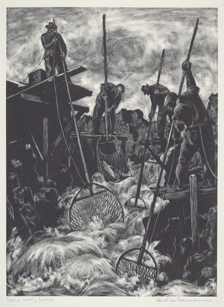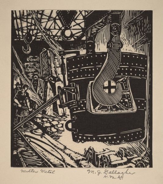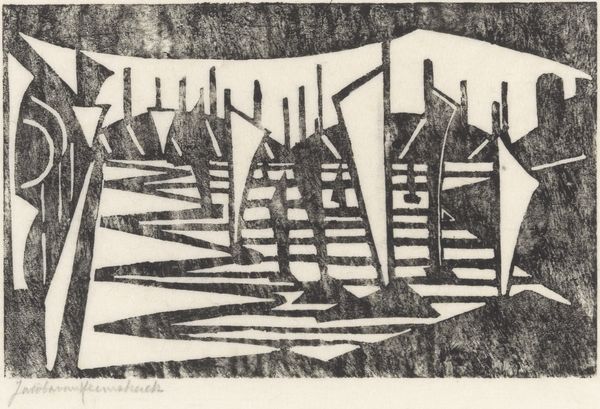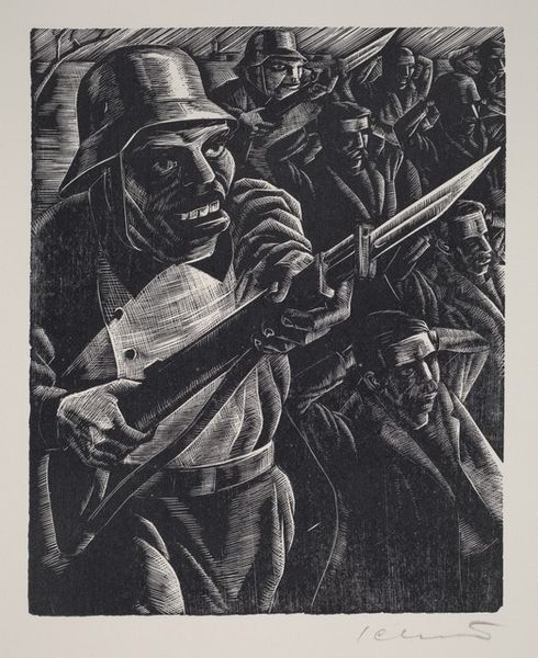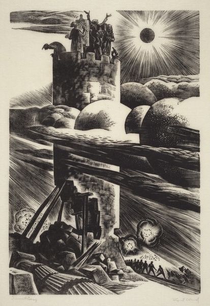 Curator: Here we have Max Pechstein’s 1918 woodcut, "Somme." It is a powerful example of Expressionist printmaking capturing the brutal landscape of the First World War. Editor: Right away, it’s like a punch to the gut. All those bleak, scratchy lines, the harsh sun, it feels devoid of hope. The faceless figures marching onward are incredibly chilling, aren’t they? Curator: Absolutely. Pechstein, like many German artists of his generation, was deeply affected by the war. Although not on the front lines, his experience as a medic gave him first-hand exposure to its trauma, profoundly influencing his art. Editor: It really does read like a bad dream—or rather a nightmare given real form through art. I am particularly struck by that distorted church tower and sun motif behind it; they almost seem mocking or oppressive, casting a shadow over the soldiers. Curator: That contrast is central. Consider that much early 20th-century art served as propaganda for all sides during World War I. "Somme", by comparison, resists that. Its Expressionistic style emphasizes subjective emotion, communicating Pechstein’s inner turmoil as well as revealing an uncensored impression of destruction and desolation. The angular lines and stark black and white emphasize raw emotions and loss in a world upturned. Editor: It reminds us that art can bear witness in ways that written history sometimes can’t, conveying feeling more viscerally than any description of landscape. Look at the sun's rays almost cutting across the image with aggressive intention. It's brutal. It sears in like some kind of psychic scar or brand across the wounded earth itself! Curator: That’s a good point, and one often overlooked today. At the time Pechstein created "Somme", prints such as woodcuts and lithographs were seen as affordable, more accessible ways to get artwork into the homes of everyday citizens, bringing ideas to the public, often cheaply. "Somme" served as a strong counter-narrative to prevailing pro-war sentiments. Editor: "Somme" isn’t about glory or victory; instead it confronts you with devastation. We’re reminded that behind statistics there are actual humans enduring pain, something easily obscured in times of large-scale conflict. Thank you for highlighting this forgotten work. I felt moved deeply today. Curator: Indeed. It is easy for artwork from over a hundred years ago to get buried beneath shifting times, especially if such works resist prevailing contemporary mores. I’m grateful you shared your insight with our listeners. Hopefully some people visiting here today will reconsider art of this time through the more personal view offered by Pechstein's expressionistic statement here.