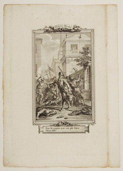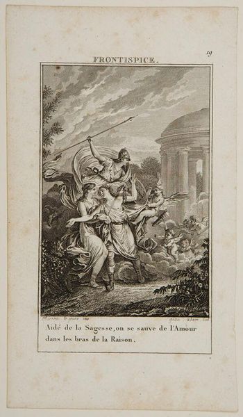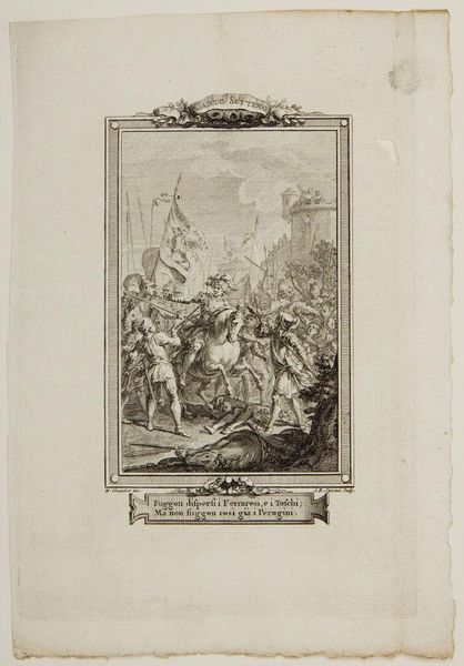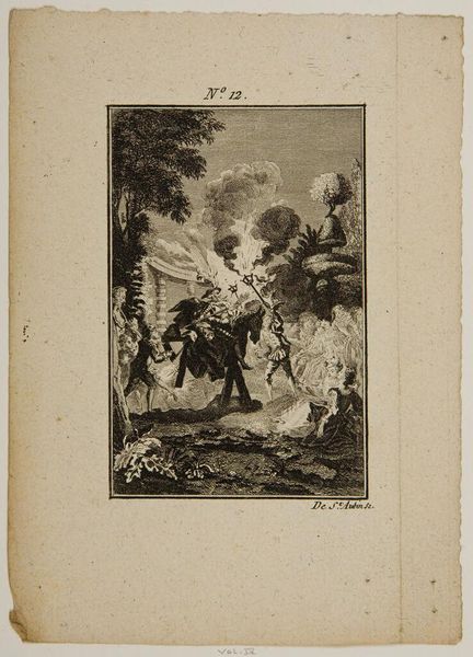 Curator: This engraving, "Don Quixote and Sancho mounted on Clavileño," by Augustin de Saint-Aubin, captures a moment of fantastical absurdity. Editor: It’s wonderfully theatrical! The central image of the two figures on a wooden horse evokes a playful, almost carnivalesque atmosphere amidst the witnessing crowd. Curator: Exactly, Saint-Aubin encapsulates the performative nature of Quixote’s delusions. The ‘Clavileño’ itself is a constructed reality, a symbol of imagination taking flight. Editor: And look at the audience. Their expressions suggest a spectrum of reactions, from amusement to outright disbelief, highlighting the societal impact of Quixote’s antics. Curator: Yes, their presence underscores the social commentary inherent in Cervantes' work. It showcases how easily beliefs can be manipulated within a community. Editor: It really underscores how narratives, even fabricated ones, can profoundly affect the social and political landscape. Curator: Indeed, the power of fabricated realities to shape public perception. Editor: A timeless theme, captured brilliantly.