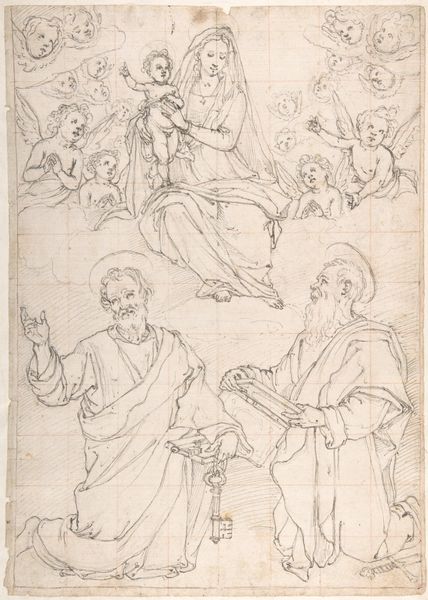 Editor: This pencil drawing, "An Apostle Guided by an Angel" by Agostino Masucci, captures a rather intimate and fleeting moment. I find the sketched quality gives it an interesting sense of immediacy. What strikes you most when you consider this piece? Curator: Considering it historically, I'm struck by how this drawing reflects the function of religious imagery during the Renaissance. The Church was, arguably, the foremost patron of the arts. So, how do you think a drawing like this served its cultural function in shaping beliefs or bolstering religious narratives for the public? Editor: I suppose drawings like this allowed for greater accessibility of religious figures? Maybe disseminating approved narratives? Curator: Precisely. Academic art, prevalent in the Italian Renaissance, was all about order and the illusion of realism. Masucci employs a portrait style. The figures almost look like individual characters or actors in a drama, as opposed to idealized beings. But the inclusion of an angel points us to history painting. Do you think this creates more of a human connection? Editor: Absolutely! The expressions and body language feel very relatable, even though it's a historical and religious scene. The angel gives that immediate connection to the spiritual element though, which the apostles can directly represent. Curator: Think about how this sketch would be received and used within the broader framework of art production. What purposes might this particular drawing have served beyond being an end in itself? Editor: Perhaps it was a preliminary study for a larger, more elaborate work. A tool for visualizing compositions. Now I think about the art within religious or public service during this time! Thank you! Curator: Indeed. Seeing it in this light reveals much about art's socio-political role, as well as Agostino Masucci's contribution.