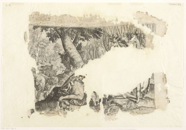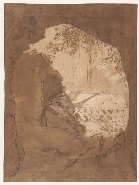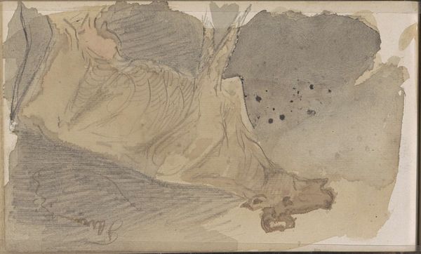 Editor: This sepia drawing, an untitled landscape by George Chinnery, feels both rugged and serene. The mountains loom, yet the trees offer a sense of quiet contemplation. What feelings does this piece evoke for you? Curator: Ah, it whispers of travel and distant shores, doesn't it? The monochromatic palette forces us to focus on texture, the stark simplicity revealing a raw beauty. I almost feel the artist's hand trembling with the ship's movement as he captured the scene. What do you make of the artist’s technique, the way the lines fade in and out? Editor: It’s as if he’s inviting us to complete the picture, to imagine the missing details. Thank you. Curator: A pleasure. It makes you wonder, what personal stories are hidden in this artwork?