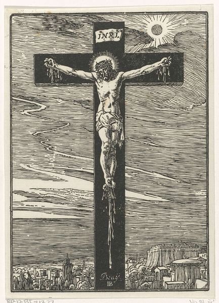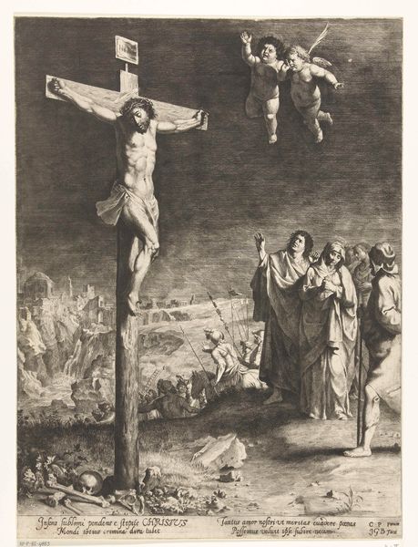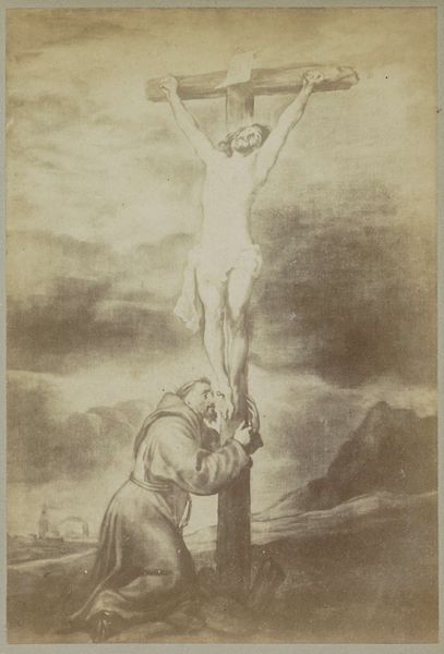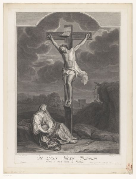Editor: Right now we're looking at Carl Bloch's "Christ on the Cross," an etching from 1884. The starkness of the graphite gives the scene such a weighty, somber feel. It really emphasizes the solitude of the moment, doesn't it? What jumps out at you when you look at it? Curator: The sheer vulnerability, I think. Notice how Bloch positions Christ—not heroically posed, but almost slumped. And then the landscape. It's bleak, almost oppressive. Makes you wonder what he's trying to say about faith and abandonment, doesn't it? Almost makes you wonder if even the heavens have turned their backs on this moment. Do you see the figures at the foot of the cross? They seem to be sinking into the earth itself, swallowed up by their grief. Editor: That's a great point about vulnerability! The other figures are drawn very intimately...Was it typical to portray religious scenes with this much...raw emotion at this time? Curator: You know, what strikes me is how unconventional it actually is! Bloch, despite working within a religious framework, manages to tap into a universal sense of suffering. It’s intimate, as you noted, and almost painfully human. I think that's what makes it so powerful, even now. It dares to imagine, in raw terms, what such a devastating event would mean, how it would *feel*. Editor: That resonates a lot! It's much more personal than I initially gave it credit for. I was so focused on the composition that I missed the individual feeling. Curator: Precisely. Art does that, doesn’t it? Reveals itself in layers, like peeling an onion... only hopefully less tear-inducing. Editor: Absolutely. It definitely gives you a lot to consider about finding meaning in desolation, artistically and perhaps personally too. Curator: A truly reflective encounter! It brings us back to asking, in what ways can we accept the burden of loneliness or anguish? Are these expressions inherently beautiful?