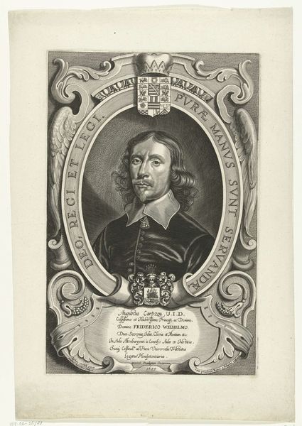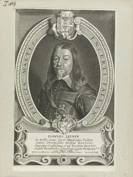Curator: This image is an engraving from 1648 by Pieter de Jode II. It’s titled "Portret van Johann Ernst von Pistoris von Seusslitz," and it's currently held at the Rijksmuseum. Editor: It’s striking how somber the man appears, almost melancholic. Despite the elaborate oval frame and the crest above his head, there's a sense of gravity to the portrait. Curator: It does capture a specific mood, doesn't it? The baroque style often sought to convey a depth of emotion. Look at how the engraver used hatching to create the illusion of shadow and light, really bringing out the texture in his velvet coat. But also notice the symbolic frame, "Fortuna Iuvat Virtutem", a saying implying that Fortune favors the brave or virtuous. Editor: I am interested by how printed portraiture of this kind helped construct ideas around nobility and power in the mid-17th century. I am also reminded that at that time these items weren’t simply personal mementos; instead they were produced and traded as a medium through which power relations were performed in both domestic and international politics. Curator: Indeed. Engravings such as this served to broadcast an image and reinforce a status, quite literally printing a lasting idea of authority. What does the intricate detail of the coats of arms convey to you? Editor: To me, that imagery speaks to lineage and legacy—visual anchors to an illustrious past but, importantly, also ambitions for the future. Every visual element serves the central purpose to establish identity. I imagine most viewers in that era would understand these heraldic emblems on a quite direct level. Curator: Absolutely. To see these repeated across a variety of artwork of this period implies the endurance and adaptation of older visual conventions in service to new social norms. Editor: Overall, this piece serves as a time capsule, presenting to modern audiences period aesthetics but also codes by which past power was exercised and visualized. It speaks volumes beyond the solemn depiction of an individual. Curator: Well, by investigating images and artifacts of our past like these, we are offered new methods of reflecting on ourselves.