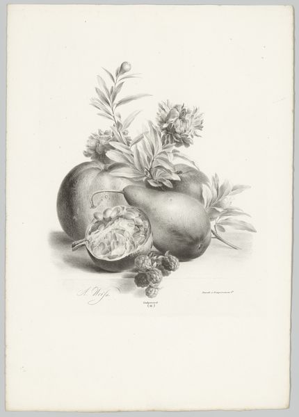 This lithograph, "Bloemen, perzik, nectarine, druiven en bramen," was created by Anton Weiss. The initial impression is one of subdued elegance, achieved through Weiss's careful arrangement of shapes and textures within a monochromatic palette. Observe how the smooth, rounded forms of the fruits contrast with the intricate details of the surrounding foliage. Weiss employs a structural framework, layering elements to create depth while maintaining a sense of balance. The composition invites us to consider how the artist uses light and shadow, not merely to depict form, but to establish a hierarchy within the still life. The lithographic medium, with its capacity for subtle gradations, is key here. The soft transitions challenge fixed meanings, inviting a contemplation on the interplay between presence and absence, substance and shadow. The very act of representation questions our perception of reality, reminding us that what we see is but a carefully constructed illusion.