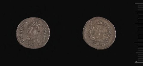 Curator: Here we have a silver coin, a "Coin of Valentinian I, Antioch," currently residing at the Harvard Art Museums. Editor: It appears worn, doesn't it? I imagine the feel of it—cold, perhaps a little greasy from handling. It speaks of exchange and labor. Curator: Absolutely. The laurel wreath around the inscription—a promise of victory. The stern profile of Valentinian himself, facing right—a very traditional symbol of power. Editor: And the inscription itself, Vot V Mult XX, surrounded by what looks like a wreath or garland. What was the process of minting these? Who handled the die? What was their skill level? Curator: The imagery aimed to project stability and divine right. Valentinian needed to consolidate power quickly. Think about the psychological weight of seeing this daily. Editor: I find myself drawn to the physical process of creating such an object. Curator: The intersection of power and everyday use is fascinating. Editor: Indeed, a small object carrying immense weight.