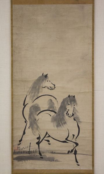 Urushibara Mokuchū created this woodblock print of a horse, sometime in the early to mid-twentieth century. Urushibara was a master of traditional Japanese techniques and was also deeply influenced by his travels in Europe. Here, we see a horse rearing up on its hind legs, rendered with bold, calligraphic lines. Horses in art often symbolize power, freedom, and virility. But in the context of early 20th century Japan, as it reckoned with Westernization and its own imperial ambitions, this image takes on added layers of meaning. Is this horse a symbol of Japan's strength, or perhaps its struggle to balance tradition with modernity? Consider, too, the artist's own position. Urushibara navigated both Japanese and European art worlds, and in this print, we can see a fusion of Eastern and Western aesthetics. The monochromatic palette and simplified forms speak to Japanese traditions, while the dynamic composition hints at Western influences. This print invites us to reflect on identity, cultural exchange, and the artist’s negotiation of his own place in a rapidly changing world.