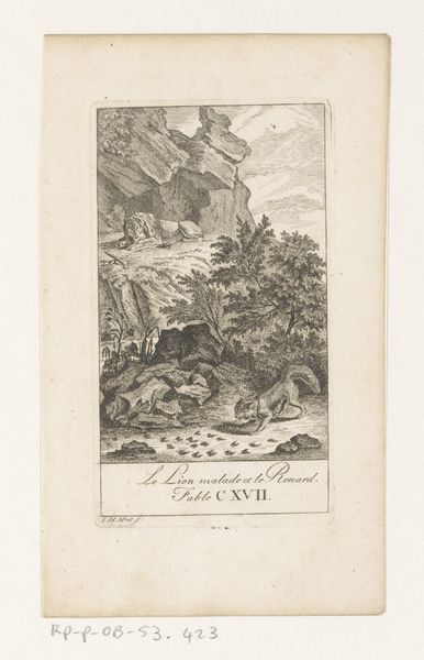 Curator: Johann Heinrich Meil the Elder created this engraving in 1758. It’s titled "Fabel van het paard dat zich wil wreken op het hert," or, in English, "Fable of the horse that wants to take revenge on the deer." Editor: It has an immediately unsettling feel to it. The image of the horse and rider leaping over what appears to be a stream… something about the stiff posture suggests unease, and there’s a rather sinister tone at play, right? Curator: Absolutely. Look at the title. It clues us into the political and social dynamic. A fable is often deployed as a mirror, reflecting societal ills under a deceptively simple guise. Who holds power, who seeks revenge, and against whom? It invites interrogation of these power dynamics. Editor: The image certainly resonates with familiar tropes of vengeance and the abuse of power. We’re so used to seeing the horse symbolize strength, power, loyalty—but here there’s a distinct break. Can you decode other aspects of the scene in this context? Curator: The visual elements become laden with potential allegorical weight. For example, the forest in the background isn’t merely landscape. What did the wilderness represent to Meil's contemporary audience? Was it chaos, or a natural space where societal conventions didn't hold the same sway? Consider also that while the horse enacts revenge upon the deer, it does so while subjugated under the rule of a human rider. Is freedom truly won when one form of domination is simply exchanged for another? Editor: Interesting point! This speaks to me of the cyclical nature of such acts of vengeance, where there's always another power at play. In terms of symbols, the deer is often seen to symbolize grace and gentleness. I can't help but feel a sense of loss in the narrative—innocence displaced or threatened. Curator: It seems the print manages to collapse innocence, complicity, and exploitation into one scene. By viewing such stories of past times we start reflecting how present these themes are nowadays as well. Editor: Absolutely! The engraving is like an entire system of meaning contained in an antique mirror, really—one reflecting issues as relevant today. Curator: I couldn't agree more, that's what I'm getting from looking at art through an activist lens. It helps contextualize the symbolism and find connections. Editor: This image stays with you long after you turn away from it.