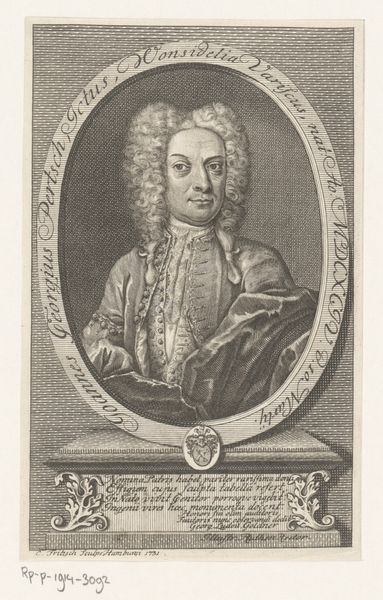 This is Jacob Folkema’s “Portret van Christian Wolff,” an engraving now held at the Rijksmuseum. The portrait is characterized by its formal composition. Wolff is presented within an elaborately decorated frame, itself set upon a plinth, creating a sense of depth. The use of line is particularly striking. Note the fine, precise lines that define Wolff’s features, clothing, and elaborate wig. The texture achieved through hatching and cross-hatching adds dimension and volume to the figure, while also emphasizing the material qualities of the print itself. Engravings like this one served a crucial role in disseminating images and ideas, functioning as a visual language understood across different social and intellectual circles. The portrait, therefore, not only represents an individual but also serves as a signifier of status, intellect, and cultural value. Consider how the visual elements within the frame contribute to our understanding of Wolff's identity and his place within the broader context of 18th-century society.