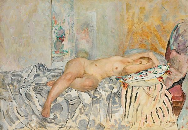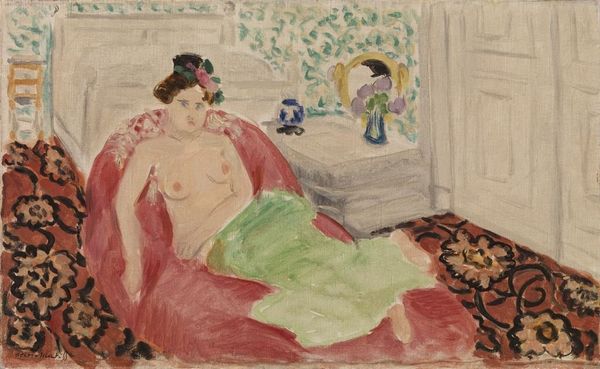 Editor: This is Gerda Wegener's "La Belle Masque" from 1922, rendered in oil paint. There’s an undeniable melancholy in the subject's downward gaze and the mask she holds. How does Wegener's societal context play into this intimate scene? Curator: Well, the 1920s were a fascinating period of social upheaval. Wegener, celebrated within the Parisian art scene, lived through seismic shifts in gender and sexual identity. Consider the political weight of depicting female nudes, especially by a female artist. How do you read the tension between the subject's vulnerability and her possession of the mask? Editor: I guess the mask could symbolize hiding or performing a role... like conforming to societal expectations? Curator: Precisely! Wegener’s art existed within, and actively shaped, a culture grappling with newfound freedoms and enduring constraints. The art nouveau style is very romantic, how does the subject appear to you? Editor: I can feel the push-and-pull between private experience and public presentation. Curator: Absolutely. The painting's "intimism" offers a glimpse into private space, but it's framed by a consciousness of the performative aspects of identity, wouldn't you agree? It speaks to the anxieties and aspirations of the time. What’s most striking to you about her presentation of women? Editor: I appreciate that she depicts her subject with so much complexity. I never thought about the power of showing intimacy. Curator: Exactly! "La Belle Masque," goes beyond being a portrait; it’s a visual document reflecting a society in transformation, challenging viewers to reconsider their understanding of art’s role within history. Editor: This gives me a totally new view of it all, thank you!