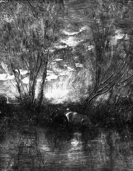 Albert Gottschalk created this oil-on-canvas artwork, River Landscape with a Bridge. Immediately, you will notice that the painting is dominated by a monochromatic palette. The subtle gradations of gray evoke a tranquil, almost melancholic mood. The composition is structured around the horizontal emphasis of the bridge and the water, bisected by the verticality of the trees. This interplay between horizontal and vertical elements creates a delicate balance. The structural simplicity is deceiving, it invites a deeper contemplation of space and form. Gottschalk’s choice to limit his palette to grayscale invites us to focus on the formal elements of the painting—the texture of the brushstrokes, the play of light and shadow, and the overall composition. In doing so he challenges our perception of landscape painting. He reduces it to its most essential components, it provokes us to question what constitutes a landscape and how we perceive our environment. Ultimately, Gottschalk prompts us to engage in a visual and intellectual dialogue about the very nature of representation.