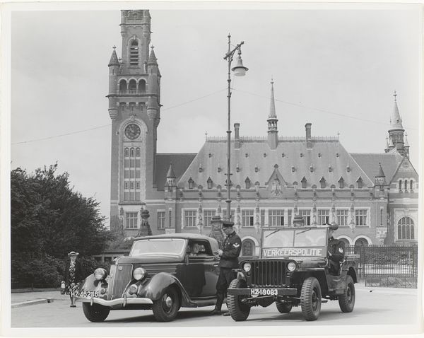 Curator: This photograph captures Queen Wilhelmina's official return to Amsterdam, likely around 1945 or 1946, taken by the Nederlandsch Christelijk Persfotobureau. Editor: The solemnity of this moment is striking— the composition emphasizes formality, with all eyes and posture bent towards her. Curator: Indeed, she stands as an almost mythical figure returning home. Black and white photography often lends a timeless, archetypal quality to images, elevating an event to something iconic. Think of the homecoming archetype. Editor: What I notice is the tangible austerity in the cityscape; the way stone signifies power, control and order in society. Also the scarcity during this time probably makes her opulent convertible seem jarring. Curator: The Queen returning to her Royal Palace signifies far more than a mere physical return. Consider the symbolism of monarchy, the crown, the inherited weight of leadership returning to its rightful place. It re-establishes a national identity, the restoration of pre-war norms. Editor: I’m interested in what's absent, and how this absence speaks volumes. You've got uniformed figures lining up to see the car arrive in front of an austere stone building, but no crowd. The work suggests we think about materials, scarcity, and rationing from the post war time, but focuses more on formal pomp. Curator: Perhaps the lack of a throng serves to amplify the central power. Or it subtly reveals an element of tension, an undercurrent of societal fatigue after immense suffering, captured rather honestly within the image’s frame. There's a palpable sense of duty here. Editor: Right. I see an interplay of materials and social control within the photographic production too—the way light and shadow carve the space, directing our gaze according to hierarchies. The value of silver and chemical processes here can almost be equated to wealth and control of the press. Curator: Viewing history through such material constructs offers intriguing socio-political insights. Ultimately this photograph transmits the resumption of established symbolism following wartime disruption. Editor: A photo, like many works of art, is a result of the way cultural, social and monetary capital impacts vision.