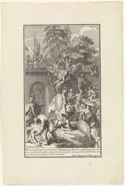 Reinier Vinkeles created this print, "Jacoba van Beieren schiet te Goes naar de papegaai, ca. 1430", around 1741. The composition is dominated by a central, vertical axis formed by the pole with the bird. This axis divides the scene, with the archer, Jacoba, and her attendants on the right, and the spectators gathered to the left. The artist used a series of diagonal lines, most notably in the bow and arrow, to create a sense of motion and anticipation. The use of hatching and cross-hatching, a technique using fine lines to create shading and texture, draws attention to the textures of the clothing and foliage. Note the strategic play of light and shadow that brings depth and realism to the scene. In many ways, this print captures a singular, historical moment. But the composition, with its careful arrangement of figures and lines, serves to elevate this specific event to something more symbolic. It engages with broader themes of power, skill, and the dynamics of looking and being seen. The formal elements of the artwork thus invite us to consider how historical moments are constructed and remembered.