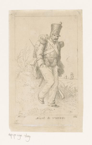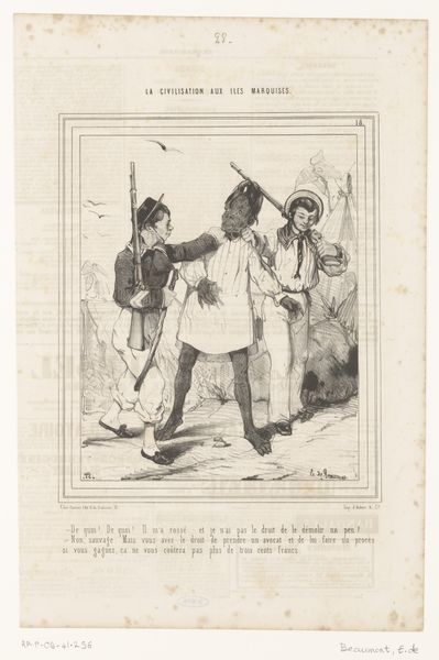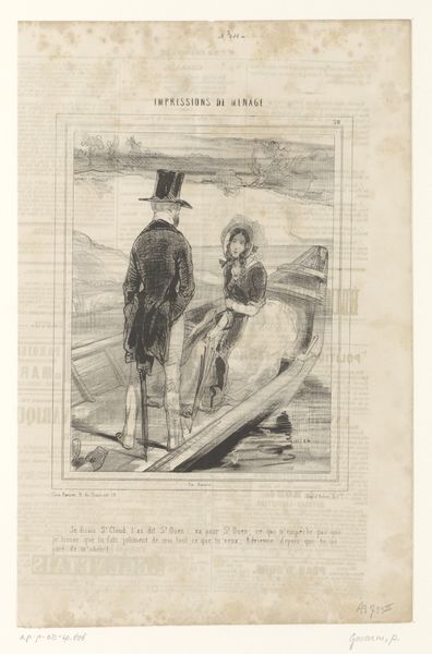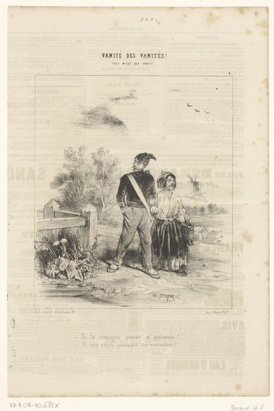 This lithograph, by Paul Gavarni, features a student and his girlfriend in a field. Made in 19th-century France, it's a moment captured during a time of significant social change, when class distinctions were both entrenched and challenged. Gavarni, born Guillaume Chevalier, adopted his pseudonym to signify his break from tradition and the established norms of Parisian society. Here, the central figures, their fashion, and their interaction reflect evolving social dynamics. The woman’s downcast gaze and posture invite questions about gender roles and expectations during this period. Look closely, and you'll notice how Gavarni uses the setting to comment on the figures' social positioning. The open field, a space for leisure, also suggests freedom, yet the couple is confined by the tall grass, perhaps symbolizing societal constraints. The lithograph subtly captures the complex interplay between personal identity and societal expectations, inviting us to reflect on our own roles within the larger social landscape.
