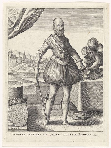 Curator: This print from 1615 by Nicolaes van Geelkercken depicts Willem I, Prince of Orange. What strikes you first about this historical figure's representation? Editor: Well, the detail is incredible for an engraving! It has a very formal, almost stoic feeling. The armor makes him look powerful, but the scene behind him is confusing; what’s going on in that distant hall? Curator: Precisely! The symbols surrounding William aren't just decorative, they narrate a story, and the hall plays a significant part. Do you see how Willem isn't simply presented as a ruler, but as a figure burdened by ongoing conflict, evident in the battle scene depicted? Editor: Yes, it does seem he’s turning away from some sort of chaos… is it significant that the armor and the helmet-on-a-stand take up so much space in the foreground? It almost feels like…preparation. Curator: Exactly! The armor isn't just a symbol of power but perhaps a constant reminder of the battles he is perpetually facing. It's part of his identity but also a heavy weight. Consider, too, that while the main scene is quite rigid, there’s movement depicted behind him. It's a strategic inclusion by van Geelkercken, wouldn’t you agree? Editor: I hadn't thought of it that way, but it definitely adds a layer of complexity. So, it's not just about showcasing Willem as a strong leader, but hinting at the ongoing struggles and the weight of leadership he carries? Curator: Indeed. The symbols aren't static; they are actively participating in a larger narrative, constantly reminding viewers about history and the individual's role within it. I'm interested, do you think this artwork aims more to commemorate Willem I's triumphs or to emphasize the sacrifices inherent in leadership during tumultuous times? Editor: I think you're right, it's a mixture. The engraving honors him, but the symbols of conflict suggest leadership demands continuous sacrifice. It certainly enriches my understanding of this era!