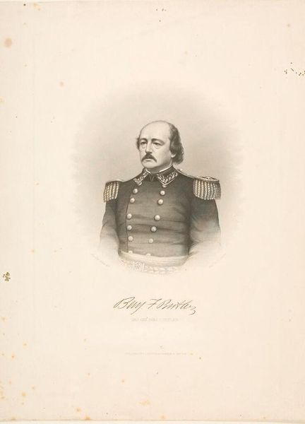 Curator: This is Dominique C. Fabronius' lithograph of Benjamin F. Butler, a controversial figure from the Civil War era. Editor: He looks stern, almost unapproachable. I’m immediately struck by how the lithographic technique emphasizes his imposing military attire. Curator: Butler served as a Union general and later as a politician. His actions during the war, especially in New Orleans, led to him being reviled by many Southerners. Editor: Right, his policies were seen as oppressive, particularly towards women. It's fascinating how this portrait, likely intended to project authority, now raises questions about power and its abuses. Curator: Precisely. Fabronius’ piece highlights the complex role imagery plays in shaping public perception and reinforcing dominant narratives. Editor: Definitely. It prompts us to consider whose stories are being told and whose are being silenced, even in something as seemingly straightforward as a portrait. Curator: Indeed, a reminder that art can be a powerful tool for both commemoration and critical examination. Editor: This image makes me wonder, what kind of narratives have been omitted?