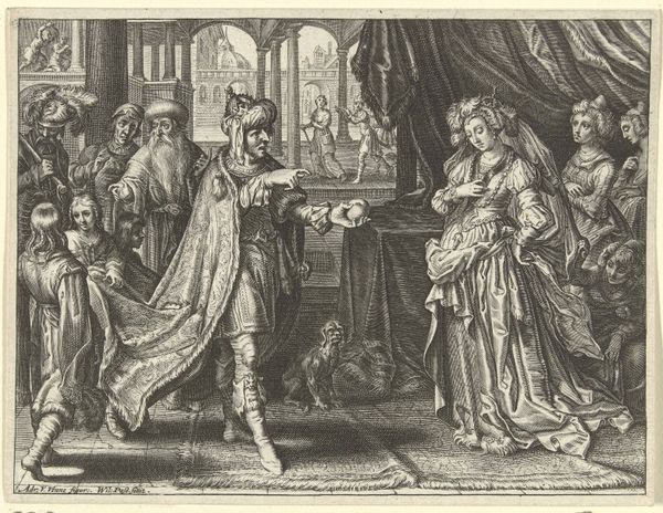 Editor: So here we have Nikolaus Knüpfer’s "Paulus the Apostle defending himself at the Trial in Caesarea", dating from about 1648 to 1652, painted in oil on wood. It’s quite a theatrical scene, almost stage-like with all these characters dramatically lit. What’s your take on this? Curator: What strikes me is the inherent drama—it’s a clash of worlds rendered in the soft, almost dreamlike quality of the baroque. I imagine Knüpfer pondering: what's it like to be Paul, this lone figure facing a sea of judgment? It is more than a story; it's the tightrope walk of conviction versus power, isn't it? Editor: Definitely! The power dynamic is intense. Paul seems isolated, while the figures judging him are draped in rich fabrics. How does the historical context shape our understanding? Curator: Picture 17th-century Europe. The narrative isn't just biblical. Think of Galileo, thinkers challenged, voices silenced! This echoes in the hushed, darkened corners of the painting. And perhaps in our own silences. See how the light falls unevenly, it illuminates power and obscures humanity. Don't you think there's a parallel there? Editor: Absolutely. So the darkness emphasizes the corruption, almost… Curator: Corruption, struggle, that flicker of defiance! It’s a delicious contradiction: A dark painting about fighting for light! The human soul in agonizing color, all bravado, maybe despair...but alive. What did you get out of seeing this today? Editor: I am beginning to consider how the mood and subject intersect, even with events occurring today. It seems paintings may always be in progress… Curator: And perhaps we are too, constantly reshaped by what we choose to observe. Art, when it works, never stops speaking!