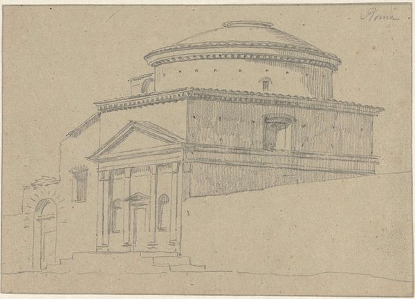 Georges Michel rendered this drawing of a small temple with graphite. The temple, with its circular form and colonnaded façade, evokes a sense of classical antiquity. The temple embodies the aspiration for order and harmony that characterized classical architecture. The echo of classical forms in later art speaks to our deep-seated longing for a golden age, a time of perceived perfection. Circular temples, reminiscent of ancient Roman architecture, recur throughout history, serving as symbols of idealized spaces and spiritual retreats. This architectural motif has evolved, carrying different cultural and philosophical meanings through time, reflecting a collective yearning for stability. The geometric regularity of the temple, juxtaposed with the natural, organic forms of the surrounding trees, creates a tension that engages viewers, prompting introspection on the relationship between humanity and nature. This juxtaposition, deeply rooted in our subconscious, evokes a sense of longing for a balanced, harmonious world.
