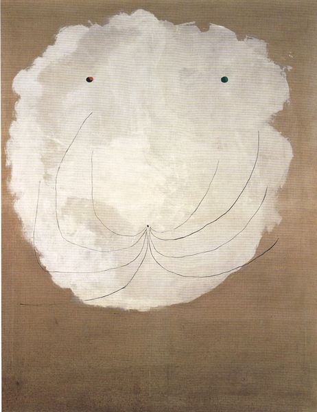 Editor: So, this is "Goutte d'eau sur la neige rose" by Joan Miró, from 1968. It's a mixed media painting. I'm really struck by the bold, simple shapes against that warm orange background; there is almost a feeling of playful stillness to it. How do you interpret this work? Curator: This piece, to me, speaks to Miró's exploration of the self in relation to the world. The seeming simplicity belies a complex layering of meaning, wouldn't you agree? Consider the sociopolitical climate of 1968, a year marked by global upheaval and protest. How might Miró, a Catalan artist who lived through the Spanish Civil War, be engaging with such turbulence through his art? Editor: That's interesting, because the forms feel so biomorphic. How can we relate his interest in surrealism, abstraction, and organic forms, to wider struggles? Curator: I see the biomorphic forms as potentially subversive, a disruption of established power structures through embracing the fluid, the ambiguous, and the irrational. It's a call to reimagine our relationship with the world and with each other. Perhaps this work encourages resistance to prescribed roles of what an individual can be and what society determines for each individual. Does that resonate? Editor: It does! I see that the use of organic form, surrealism and abstraction can signify challenging the constraints in defining oneself. Thanks so much, I hadn’t really considered the cultural backdrop and its potential effects. Curator: Indeed, this piece underscores the value in understanding art as inextricably linked to social movements. I, too, will reflect on our discussion as I view Miro's artworks in the future.