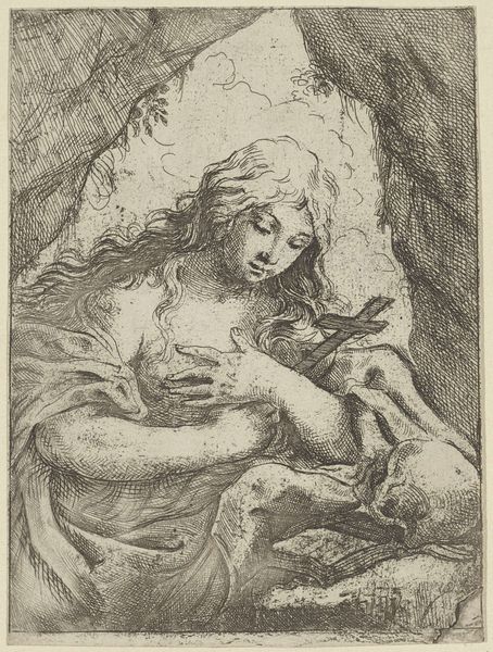 Editor: Here we have Odoardo Fialetti's "Venus and Amor Sleeping," an undated etching. The composition is striking, a study in contrasts of light and shadow. What elements of its formal structure stand out to you? Curator: The interplay of line and form is compelling. Observe the dense hatching creating depth and texture, juxtaposed with the smoother areas defining the figures of Venus and Amor. How does this contrast affect your perception? Editor: It emphasizes the figures' three-dimensionality, setting them apart from the chaotic landscape. The diagonal lines, especially, create a sense of movement. Curator: Precisely. The diagonal axis, further reinforced by the placement of figures, guides the eye and creates a dynamic tension within the confined space. Notice how the artist strategically employs light to enhance the tactile qualities of the flesh. The visual harmony between the figures and the landscape creates a unified sensory experience. What have you learned from this work? Editor: I now see how the artist used formal elements to create a dynamic and textured composition.