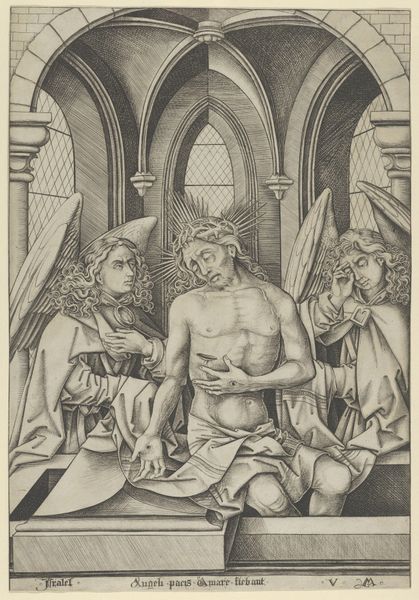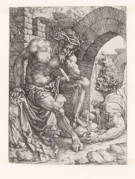 This small print, "Christus op de koude steen," was made by Jan Gossart, likely in the early 16th century, using the engraving technique. Engraving involves cutting lines directly into a metal plate, traditionally copper, with a tool called a burin. The incised lines hold ink, which is then transferred to paper under high pressure. Look closely, and you'll see the crisp, precise quality of these lines, defining form and shadow with remarkable detail. The image shows Christ during his Passion, and Gossart powerfully conveys the weight of his suffering. The choice of engraving is significant. It was a painstaking, laborious process, demanding immense skill and patience from the artist. This level of dedication mirrors the endurance of Christ himself. Furthermore, the medium of printmaking allowed for the widespread distribution of images, making art more accessible. By considering both the physical effort involved in its making and the broader context of its dissemination, we gain a richer understanding of Gossart's work, blurring the boundaries between art, craft, and social communication.
