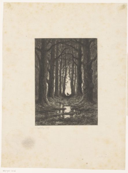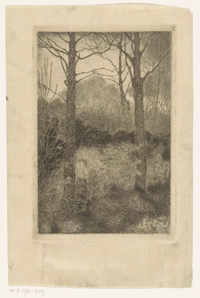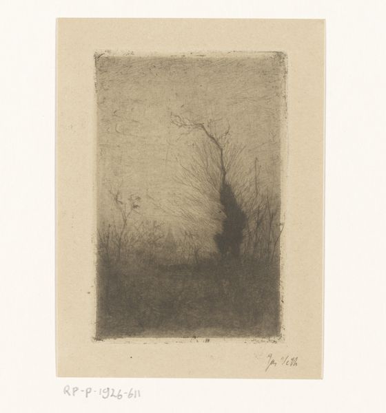 Curator: "Boerin bij een schuur", or "Farmer's Wife Near a Barn," created between 1887 and 1952, an etching by Chris van der Windt held here at the Rijksmuseum. What are your first impressions? Editor: Somber, stark, and weathered. The composition is dominated by a palette of grays achieved through crosshatching. It’s bleak, yet there’s a quiet strength in the way the woman merges with the landscape. Curator: This print utilizes the etching technique, meaning the artist would have applied acid to a metal plate to create these lines. Van der Windt was working during a period where there was increasing industrialization and an attendant romanticization of rural labor and lifestyle. The physical work embedded in printmaking also highlights these realities. Editor: Yes, I find it telling how the labor involved in depicting rural life mirrors the laborious existence of its subjects. Looking closer, the farmer’s wife appears almost stooped over; we cannot see her face. Her figure becomes intertwined with the barn and even the trees. Is this a comment on the limited role of women within the Dutch agrarian landscape? Curator: Possibly. I also wonder about the economics of printmaking at the time, which democratized images and made them accessible to a broader public. Realism as a style sought to depict the unvarnished truth of everyday life; prints were often the primary medium for this. Editor: This etching evokes the kind of paintings by Millet or even the somber earth tones of early Van Gogh. But its more than just aesthetics. It raises awareness about labor practices, rural poverty and the everyday realities that often go unseen by the elite. How do class and gender intersect here to shape our perception of labor? Curator: Considering those details allows us to better comprehend how artistic materials, techniques and economics together shape the work and it's reception. This connects with our present consideration for sustainable art and fair labor. Editor: And those lines of inquiry illuminate how representation can either reinforce or disrupt historical inequalities. That this small work generates such discussion proves the artwork retains a striking visual voice.