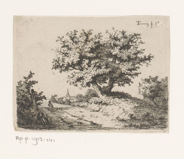 Jean Alexis Achard created this landscape with trees as an etching measuring 137 by 155 millimetres. The overall impression is one of dense, intricate layering, where the shapes of trees and foliage blend with the textures of the earth. Achard's composition employs a delicate balance between detail and abstraction. Notice the interplay of light and shadow, achieved through fine lines and tonal variations. The texture creates a visual rhythm that invites the eye to wander across the scene, seeking moments of clarity within the complexity. Achard’s work can be seen as an exploration into semiotics. The trees are not merely representations of nature, but signs within a visual language. The artist challenges the viewer to interpret the relationships between these signs, thus, destabilizing the traditional landscape. The artist invites us to contemplate the nature of representation itself, creating a space for endless re-interpretation.