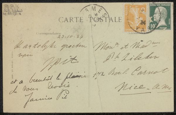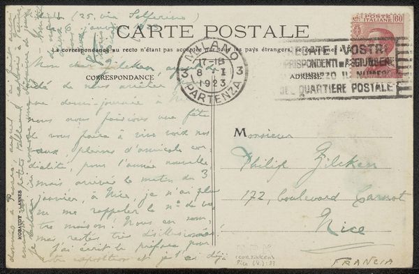 This "Briefkaart aan Henriette Wilhelmina van Baak" was made by A. Vincentelli, probably in 1942, using ink on paper. The sepia tones and faded stamp give the card a quiet dignity, a kind of melancholic beauty. The stamp is dark and contrasts with the lightness of the card. The ink is darker still. I love the way the handwritten text sprawls across the surface, each word a little gesture, a record of a moment in time. Look at how the ink bleeds slightly into the paper, creating soft edges. This is a reminder of the physical process of writing, the way the ink flows from the pen onto the page. It reminds me of Cy Twombly's scribbled paintings, where the act of mark-making becomes a dance between intention and chance. This card reminds me that art is not just about grand statements, but about small, intimate gestures that connect us to each other and to the past. It’s a gentle nudge towards seeing the beauty in imperfection and the poetry in the everyday.