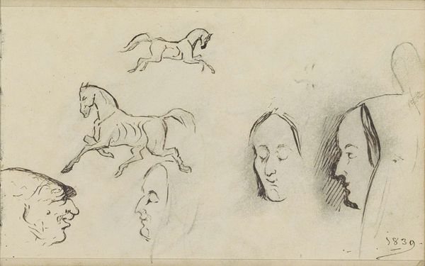 Curator: Here we have "River Landscape with a Mill and Sailing Ships and Heads," created around 1864 by Johannes Tavenraat. It's currently held in the Rijksmuseum's collection, an intriguing ink drawing rendered with pen. Editor: My first impression? It feels like catching glimpses of fleeting thoughts, or sketches in a wanderer’s journal—faces observed in passing, dreams of serene waters and windmills. The raw, unfettered quality is compelling. Curator: The placement of those 'heads' interspersed with the landscape is certainly curious. We see multiple profiles— mostly of women, identifiable by their head coverings—alongside that sketchy rendering of a riverside scene. These visual combinations create a layered sense of looking, not just at individuals but perhaps into a specific community. Editor: The women, particularly those with their elaborate headwear, give off a sense of almost photographic preservation. Almost as if they existed at the time of the author or perhaps a study on types. The figures almost become a visual index, their subtle variations inviting you to see them as real personalities, too, captured at that time. Curator: Absolutely. The details, however minimal, are enough to root them in a particular social context. Also the ink medium is so central; it is such an unassuming but long lived one, we feel so aware of our own present, because ink carries that legacy with it. We see history marked both culturally and personally, really. Editor: And you almost expect the old paper and ink to crack under pressure. It does make you ponder about how the passage of time itself can act as an unsparing collaborator. Its not quite finished but I think its that 'snapshot of now' aspect that allows for new context today. Curator: Indeed. This isn't a 'finished' painting; its that intimate peek behind the scenes that captures attention. It offers a direct connection to both the subject of the artwork and the way art happened back then. Editor: You are right; maybe the incompleteness makes it complete as an evocative fragment, then. What else can be said. Curator: A glimpse of how identities and place intertwine and time passes through everything.