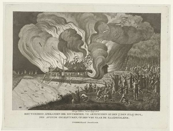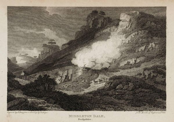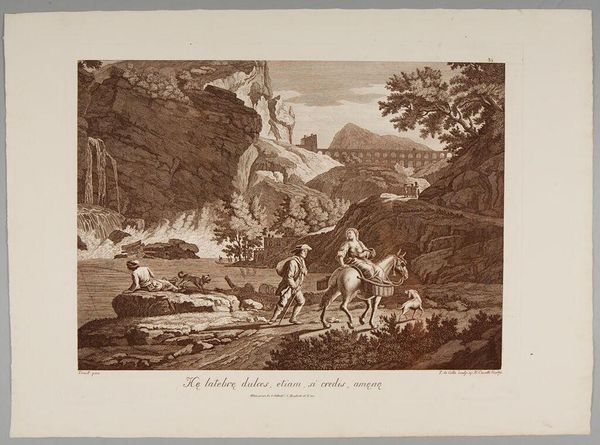 Curator: This is Friedrich Wilhelm Gmelin's "View of the Falls of the Rhine at Lauffen near Schaffhausen," housed right here at the Harvard Art Museums. Editor: It's overwhelmingly grey. The churning water, the sky, the rocky landscape—it all feels rather bleak, like industry has already touched this place. Curator: Interesting. I see it as a commentary on the sublime, but viewed through the lens of burgeoning modernity and the socio-political upheaval of the late 18th century. Those tiny figures feel so dwarfed by the natural forces at play. Editor: I am drawn to the material reality of those churning falls. It feels like Gmelin really understood the immense labor required to harness that water, even in 1790-something. The potential for energy, for work… Curator: Yes, and think about who had access to the Rhine's resources. Issues of class, land ownership, and access become central to understanding not just the landscape, but who benefits from it. Editor: Exactly. These landscapes aren't just picturesque; they're loaded with potential energy, with the social implications of natural resources ready for exploitation. Curator: A stark reminder that our relationship with nature is always mediated by power. Editor: Absolutely. It grounds the sublime in the very real struggles for resources and control.