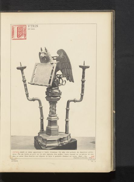 Editor: This is a gelatin-silver print from before 1887, showing the Messing doopvont (brass baptismal font) in the Sint-Martinusbasiliek in Halle, Belgium. The grayscale and aged look of the print lend the image a serene quality, almost like looking at a faded memory. I am fascinated by the ornate gothic tracery of the Basilica behind the baptismal font and the metallic texture of the piece itself. How do you read this work? Curator: Primarily, I am interested in the formal relationships established by the photographer. Note how the geometric severity of the baptismal font plays off against the intricate gothic details in the architecture of the Basilica, and further notice how the artist exploits contrasts to organize forms and create an overall harmony within the piece. Do you perceive, as I do, a skillful arrangement of forms creating depth within the composition, given that it is a monochromatic photograph? Editor: Yes, the way the light falls definitely emphasizes the textures, offering contrast and therefore visual depth. How much significance do you ascribe to the gothic aesthetic? Curator: Gothic style is pertinent as it structures the narrative within the work; look at how its linearity contrasts with the basin’s curvature. Furthermore, Gothic vertically enhances the composition; the work thus establishes the dichotomy between terrestrial horizontality versus the sacred skyward trajectory. How does the composition, coupled with the font's medieval aesthetic, influence your perception? Editor: It makes me see the print not just as a documentation, but as a meditation on time and architectural narrative; this photo offers a visual symphony of contrasting styles and beliefs frozen in a moment. Thank you! Curator: Precisely! Photography immortalizes a singular architectural space, emphasizing form and style above its original spiritual purpose. My pleasure.