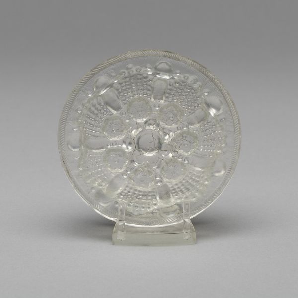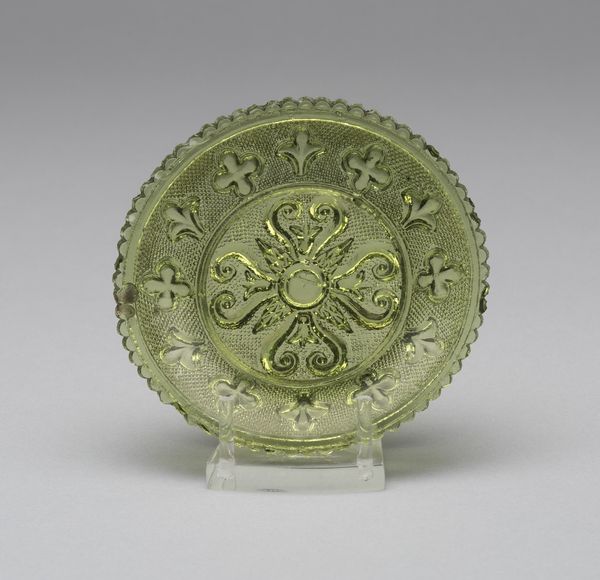 This cup plate, now at the Art Institute of Chicago, presents an intriguing study in texture and form within a small scale. The anonymous creator worked with a vibrant blue glass, manipulating its materiality to capture a sense of both delicacy and robustness. The plate's surface is articulated with raised patterns, an interplay of smooth, ringed shapes against a stippled background. This juxtaposition of textures invites tactile exploration, even from afar, and the concentric design emphasizes the object's circular nature. The plate appears to be almost alive with a bubbling effect that creates an optical vibration across its surface. The overall effect challenges our perception of utility by elevating a functional object to something of visual interest. This piece functions as both an object of practical use and a study in the manipulation of material and form. It blurs boundaries and invites ongoing dialogue.