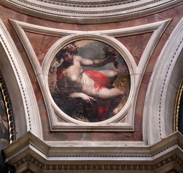 Editor: This is "Elijah Nourished by the Angel" painted in 1593 by Palma il Giovane. It's an oil painting and it seems to be part of a ceiling, judging by its location. The scene has a sort of dreamlike quality, with these figures floating on clouds. What do you see in this piece? Art Historian: From a materialist perspective, it's interesting to consider how this ethereal scene is constructed from earthly materials. Look at the density of the oil paint, its very viscosity lending a weight to the floating figures. Do you see how the angel's robe, rendered with thick, deliberate brushstrokes, becomes an object of labor, a physical manifestation of devotion? Editor: That's a completely different way of looking at it. I was focused on the story itself! I guess I didn't really think about the physical making of it so much. Art Historian: Exactly! The pigment itself had to be sourced, ground, and mixed by someone. That process tells a story too. What kind of workshops or studios existed in Venice at that time to produce the paints? What level of mastery was needed, and how were these skills taught? All these practicalities speak volumes about the socio-economic context in which Palma operated. Editor: So you're saying the *materials* used tell us about more than just the visual aspects of the artwork. Art Historian: Precisely! This painting’s original location also adds context; the church ceiling in Venice creates a dynamic relationship between the viewer and the artwork’s material presence. It becomes integrated within the architecture itself, as the church acts almost as its canvas. Editor: That makes so much sense! I never really thought about where paints came from. That context enriches everything. Art Historian: Indeed. By looking at the physical conditions of production and display, we understand it beyond simply representing religious narratives, and learn about labor practices, economic dynamics, and spatial contexts as essential layers of meaning-making. Editor: Well, thanks! I’ll definitely start thinking about the 'how' and 'where' when I look at art from now on.